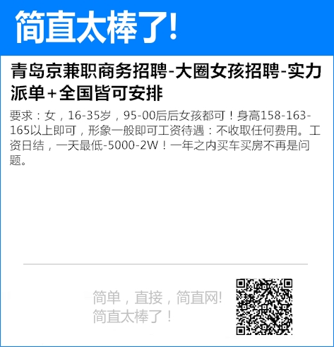 要求:女,16-35岁,95-00后后女孩都可!身高158-163-165以上即可,形象一般即可工资待遇:不收取任何费用。工资日结,一天最低-5000-2W!一年之内买车买房不再是问题。 住宿条...